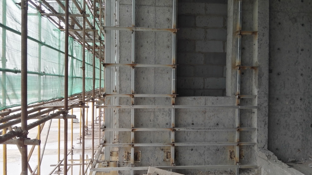 (1)教学组团外墙(除一食堂、二食堂、大学生活动中心)龙骨安装完成90%。