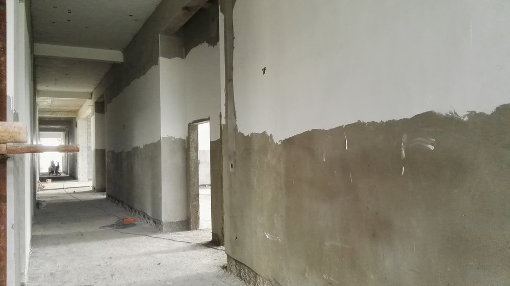 (2)教学组团(理科楼、文科楼、图文信息中心、大学生活动中心、行政楼、公共教学楼、后勤一、后勤二、一食堂、二食堂)内墙粉刷完成75%;室内腻子完成40%;