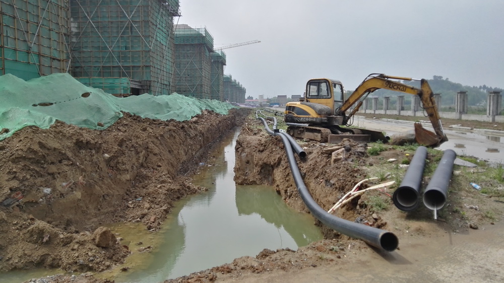 3. 给水、消防管沟槽开挖完成300m,实际完成10%,累计完成10%。
