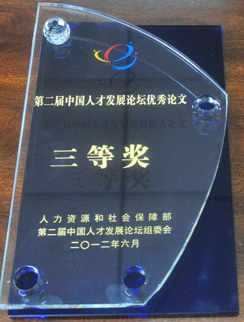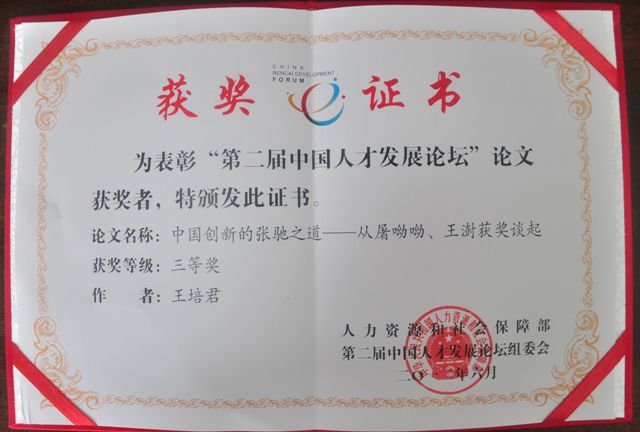 中国人才发展论坛是由国家人力资源和社会保障部发起主办的国家层面的人才论坛,本届论坛主题是"创新创业人才开发理论与实践"。论坛进行了优秀论文评选,共评选优秀论文一等奖8名、二等奖24名、三等奖36名。我院王培君副院长提交的论文《中国创新的张驰之道》荣获三等奖,大会颁发了获奖证书和奖杯。