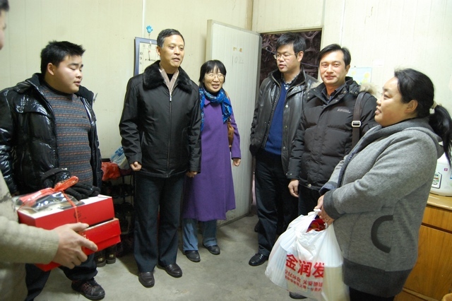 随后,刘书记一行来到草场门校区八号楼后面的平房,陈文军和他家人就住在这里。在数信院孙玫副院长、杨嵘副书记的陪同下,刘书记一行与陈文军一家三口亲切交谈。陈文军患有肌无力症,行动缓慢,对正常人而言的轻松自如的坐下,起立对他而言尤其困难,行走时需要搀扶,自2011年9月进校后一直由父母租房陪读,但该生一直严格遵守校纪校规,由于行动缓慢,他比正常人要提前1小时出门,早上8点上课从未迟到过。刘书记亲自将御寒品送到他父母手中,陈妈妈说:感谢学校的关心和和温暖。陈文军也表示:一定不辜负学校的殷切希望,努力学习,回报学校,回报社会。