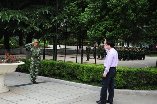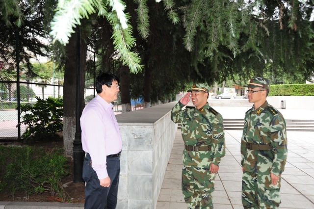9月19日上午,院党委副书记、副院长程建军来到草场门校区训练场亲切慰问全体施训教官和参训学生。武警江苏总队二支队一大队副大队长王岭峰等陪同慰问。
