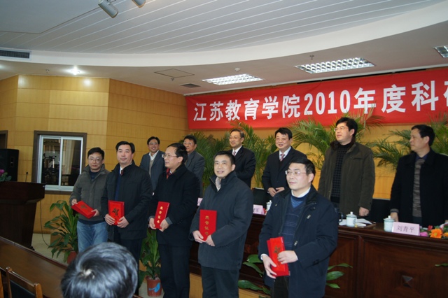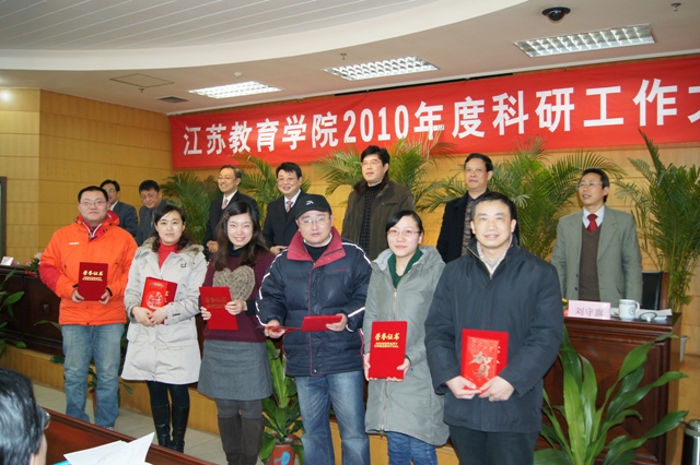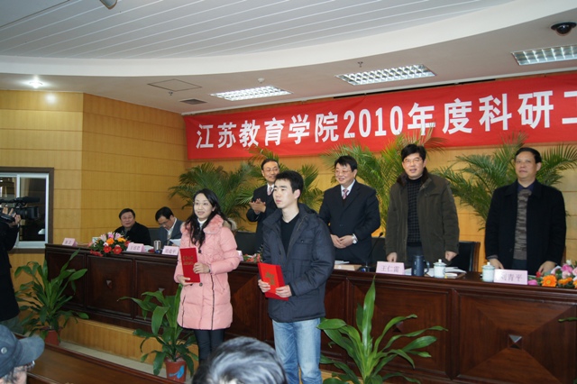 王仁雷宣读了江苏省高校第七届哲社优秀成果奖、2010年度院优秀科研成果奖、院优秀科研工作者及科技之星等有关科研奖励的表彰文件。院领导为26位获奖者颁发了证书和奖金。院优秀科研工作者耿珺博士、科技之星王曦博士代表获奖教师发言,她们精彩的演讲博得了全场的阵阵掌声。