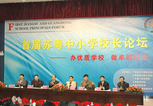12月27日至28日,江苏广东两地中小学校长相聚东莞,参加首届苏粤中小学校长高峰论坛,以应对和把握"十二五"规划开局之年的机遇和挑战,促进两省在新一轮教育改革中的交流与合作,共谋两省基础教育的改革与发展,共同推进教育均衡、践行教育规律,实施素质教育。论坛主题为"使命、责任、追求",即以实现教育现代化,培养创新性人才,建设人力资源强国为使命;恪守教育规律,以学生为本,因材施教,全面发展为责任;办优质学校,做卓越校长,让学校成为师生最幸福、最温暖的地方为追求。此次论坛是由江苏教育行政干部培训中心和广东省中小学校长培训中心联合举办,由东莞市教育局承办。