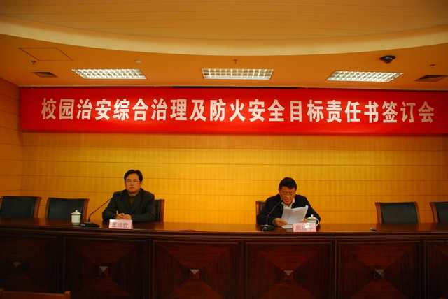 周成平、王培君分别与各院系、部门主要负责人签订了校园治安综合治理领导制目标责任书和防火安全目标责任书。