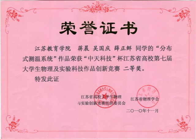 11月26日至28日,由江苏省教育厅主办、江苏省物理学会承办的"中天科技"杯江苏省高校第七届大学生物理及实验科技作品创新竞赛在南通大学举办。我院物理系蒋晨、吴国庆、薛正鲜同学的作品《分布式测温系统》荣获二等奖。该作品由赵玉成、陈青老师指导,并得到院大学生实践创新计划的资助。