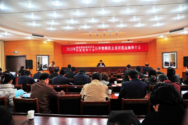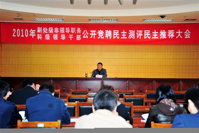 11月3日,我院举行2010年副处级非领导职务、科级领导干部公开竞聘民主测评民主推荐大会,党委副书记、副院长程建军和常务副院长周成平分别主持了上、下午的会议。院领导及副处职以上中层干部参会,共有88位同志参加了本次公开竞聘。据悉,竞聘工作将于本月15日完成。