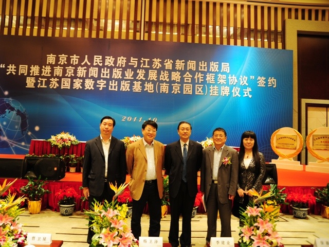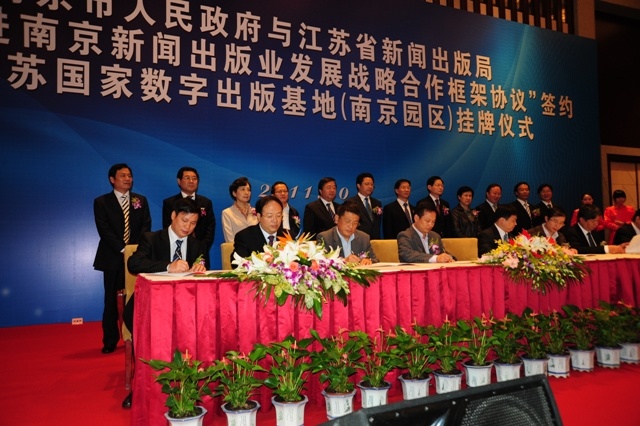 14日上午,南京市人民政府与江苏省新闻出版局"共同推进南京新闻出版业发展战略合作框架协议"签约暨江苏国家数字出版基地(南京园区)挂牌仪式在南京紫金山庄会议中心举行。副省长曹卫星、南京市委书记杨卫泽、市长季建业、省新闻出版局局长徐毅英等出席,南京报业集团以及各入驻院校、企业等领导参加。我院党委书记管向群,党委副书记、副院长程建军,常务副院长周成平在相关职能部门领导的陪同下出席签约仪式。