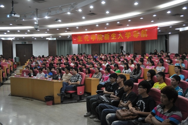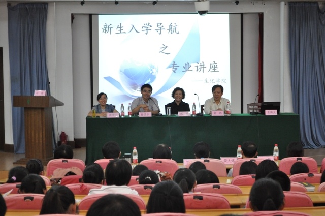 为了让12级新生对自己所学的专业有更多的了解,生化学院于9月13日晚6点在现代教育技术楼报告厅举办了"专业导航讲座",生化学院院长徐国华、党总支书记郭琦、副院长金浩、生物系主任黄雪方等出席并讲话。
