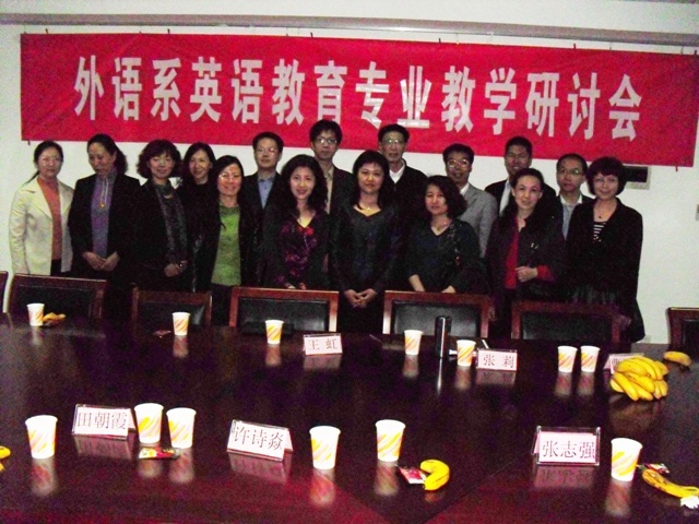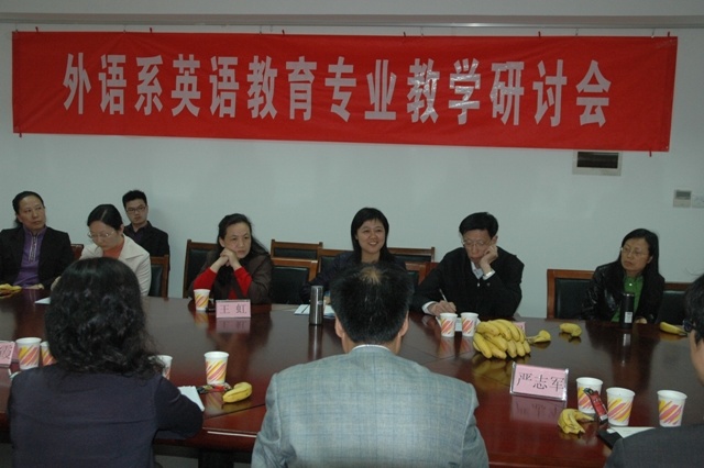 4月25日下午,外语系在教科研大楼507成功召开英语教育专业教学研讨会。南京师范大学外国语学院严志军副院长和河南师范大学外国语学院张志强副院长率领的本院学科带头人应邀参加。外语系英语教育专业各教研室主任和全体专业课任课老师到会。会议由外语系副主任张莉主持。