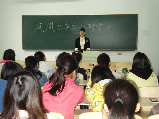 会上,黄经理向大家介绍了凤凰台饭店的基本情况,以及实习待遇、实习条件、实习安排、转正后工资待遇、发展前景等。她还结合自身工作经历,指出在酒店工作必须具备坚持的精神,必须放低心态,最后才能成功。黄经理还和同学们进行了积极的互动。