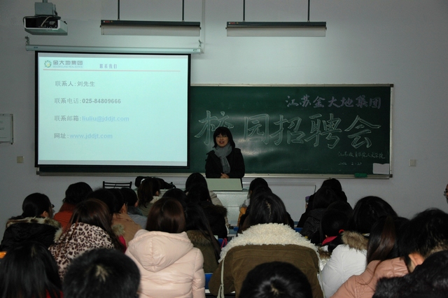 人文学院为了拓宽学生的就业渠道,增加学生的就业机会,在学院领导、老师及辅导员的共同努力下,特邀江苏金大地集团来我院进行校园招聘。