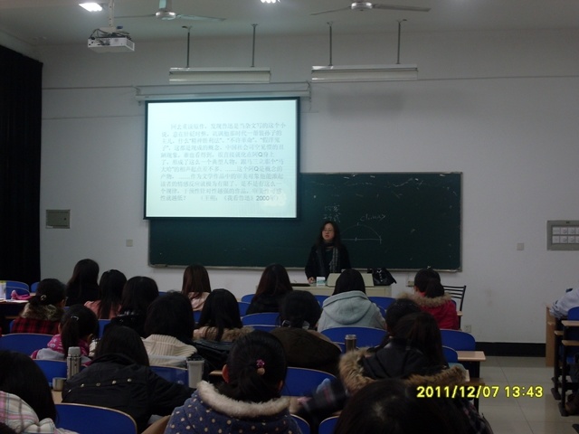 12月7日下午,周韵教授在浦口校区108教室举行了"《阿Q正传》之魅力"讲座。在详细介绍了鲁迅出生背景和该小说创作背景的基础上,周韵教授深入剖析了小说的内容和思想,阐述了自己对于小说创作的观点,指出好的文章要敢于在内容和形式上进行创新。此次讲座图文并茂,生动有趣,同学们听得津津有味。周教授不仅让同学们深刻感受了文学的魅力,而且使同学们学会了从各个不同角度去剖析文学作品,为同学们日后撰写毕业论文打下了基础。