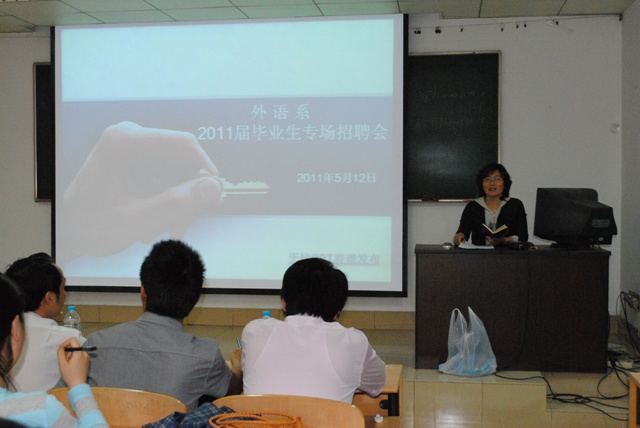 随着2011届毕业生毕业的临近,外语系的毕业生就业工作也在全力推进,5月12日下午,该系邀请江苏马力教育培训有限公司来系举行了一场专场招聘会。系党总支书记陈建琴主持招聘会,系副主任张莉以及班主任、辅导员、教务员等都来到现场对同学们进行了指导。