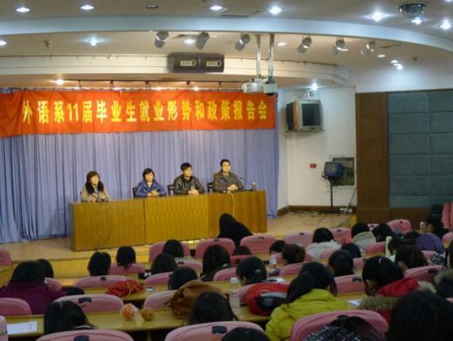 在院党委的高度重视和学工处的直接指导下,外语系2011届毕业生就业工作在系就业工作领导小组的统一领导下正在紧张有序地向前推进。为了帮助266名应届毕业生更好地了解今年的就业形势和国家的就业政策,引导他们调整择业心态、准确定位、抓住机会、积极就业,我系于 3月5日下午在现代教育技术楼二楼报告厅举行了"外语系2011届毕业生就业形势和就业政策报告会"。会议由院就业指导中心主任眭春良主讲,党总支书记陈建琴主持。学工处处长刘贵友、外语系副主任张莉等参加了会议。