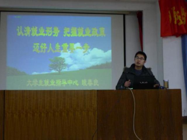 眭春良在 "认清就业形势,把握就业政策,迈好人生重要一步"的主题报告中,首先用数据向大家介绍了今年全国高校和江苏省高校毕业生的就业情况:尽管今年毕业生数首次回落,但就业形势依旧严峻。在分析了目前影响大学生就业的有利因素和不利因素后,眭春良建议大家树立"先就业后择业、先生存后发展"的就业观;介绍了当前高校毕业生的就业机制、政府扶持项目,详细讲解了毕业生就业流程、派遣工作说明以及就业推荐表、就业协议书遗失补办、改派等特殊情况的处理办法。会场非常安静,同学们认真做了笔记。
