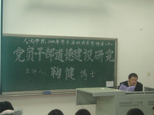 12月13日到15日,人文学院2010年学术活动周系列讲座在浦口校区举行,三次讲座分别是成谢军的《中国二元经济评述--兼议务工农民的身份问题》,鞠健博士的《党员干部道德建设研究》和梁励教授的《中国古代教育》。