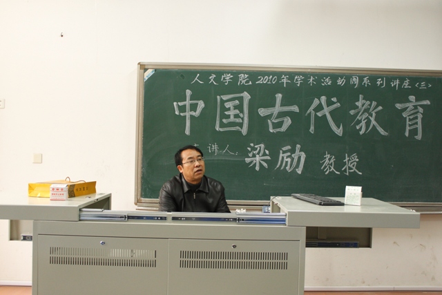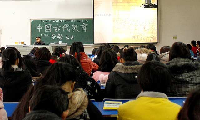 12月15日下午,人文学院2010年学术活动周系列讲座之三--"中国古代教育"在浦口校区举行。此次学术报告会主讲人为人文学院院长、历史系教授梁励,报告会吸引了全校各院系不同年级的同学前来听讲、学习。讲座现场座无虚席。