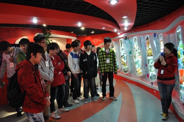 一进基地,同学们就被眼前的一箱箱层层叠起的瓶装饮料、随处可见的可口可乐标志和产品图片所吸引,个个兴奋不己。大家跟随工作人员来到了可口可乐的大厅,了解此次参观的主要行程安排。首先,工作人员引领大家来到可口可乐缤纷世界--可口可乐的博物馆,向大家详细地介绍了可口可乐的企业文化,包括可口可乐的诞生,Coca-Cola商标的问世,还有南京中萃食品有限公司的成长背景及公司生产和销售的主要饮料。大家一边了解可口可乐悠久的历史,一边还兴致勃勃地参加了馆内的互动游戏。