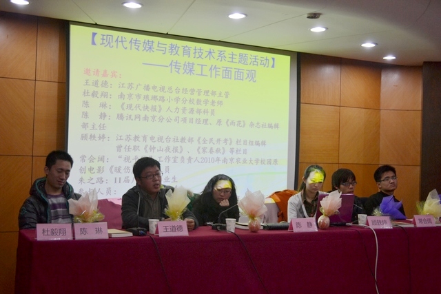 12月28日周三晚,在草场门校区教育技术大楼一楼报告厅召开了一场别开生面,以"传媒工作面面观"为主题的座谈会。在现教中心高荣国主任、张淼书记的关心下,江苏广播电视总台经营管理部主管王道德,南京琅琊路小学分校数学老师杜毅翔,《现代快报》人力资源部陈琳,腾讯网南京分公司项目经理陈静,江苏教育电视台社教部《全民开考》栏目组编辑、曾任职《钟山夜报》、《家春秋》等栏目的顾轶婷,"视平线"工作室负责人、2010年南京农业大学校园原创电影《暖伤》主创人员常会阔,11届广电班毕业生朱之路来到了座谈会现场。宣传部的陶赋雯老师主持了本次座谈会。