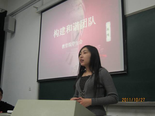 主持人先带领大家做了个比较"另类"的自我介绍,然后以幻灯片与短片交替的形式,围绕团队意识、合作意识、责任意识与创新意识四方面,向大家介绍了如何建设优秀团队的问题。为了使同学们对所探讨的问题有更深的体会,主持人还特意安排了两个游戏环节,这种理论与游戏相结合传递信息的方式取得了良好的辅导效果。