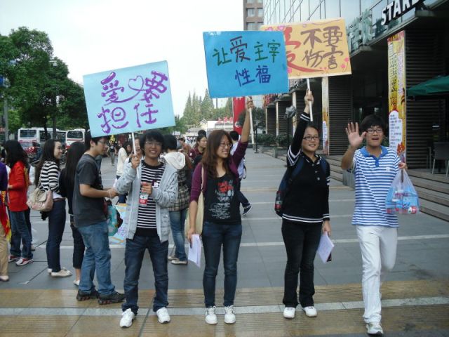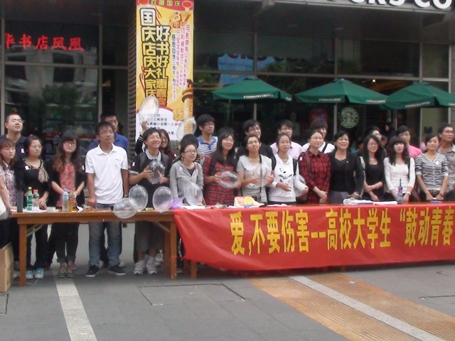 9月26号下午,来自南京工业大学、南京邮电大学、南京财经大学、南京审计学院、南京行政管理干部学院、河海大学、中国药科大学以及我院,共八所高校的三十多名大学生,在凤凰国际书城门前广场,组成"鼓动青春"宣传队,和区计生局的工作人员一起,围绕今年世界避孕日的主题--"爱,不要伤害",进行一系列的普及宣传活动。此次活动包括三个内容,一是由来自南京行政管理干部学院的八位同学,组成大学生自行车车队,在鼓楼区街道进行流动性宣传。另外两个内容是其他七所高校同学协同进行的健康知识问卷调查和街头情侣微笑留影。在此期间,同学们还向路人分发宣传手册和避孕套,向市民传递一份蓝色的关怀。