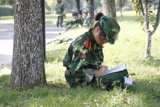 休息时间不忘写军训心得(学通社 陆大伟 摄)