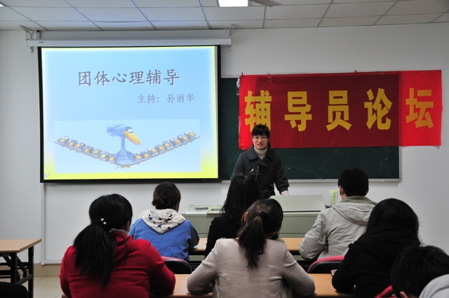 3月29日下午,本学期第一期辅导员论坛在草场门校区现代教育技术楼607教室举行。教育科学与管理学院孙丽华老师应邀为辅导员协会全体成员作了专题辅导报告。