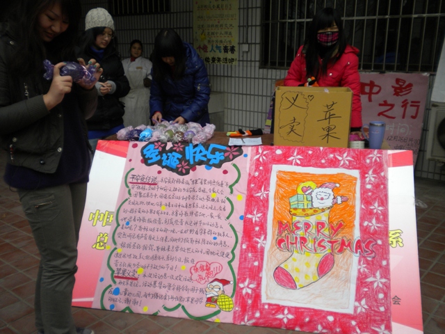 12月24日,教育科学与管理学院在小行校区食堂门口举办了"平安夜苹果义卖"活动,此活动得到了全院同学的热烈响应。