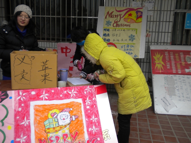 义卖活动上,许多同学和老师都奉献出自己的一份爱心,购买了苹果。此次义卖的苹果全部售出,所得钱款用来购买礼物送给雨花区聋童幼儿园的孩子们,为他们带去新年的祝福。