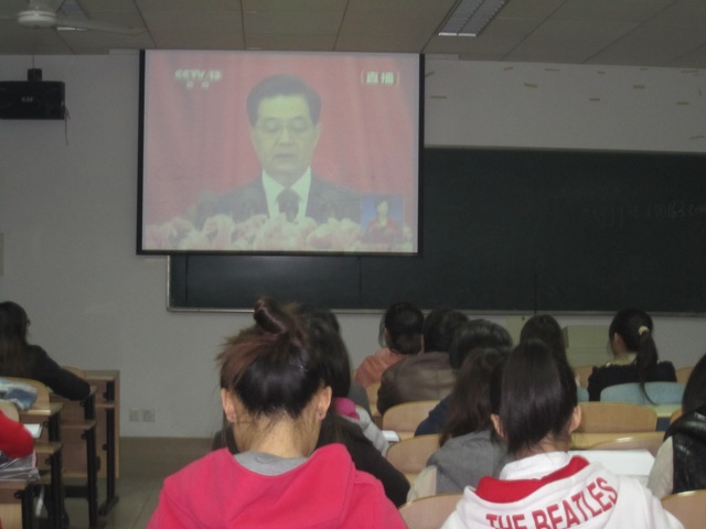 11月8日晚,数信院党总支组织数学、信息学生党支部全体学生党员在草场门校区教学楼②—401教室观看了党的十八大开幕式录像,聆听了胡锦涛总书记所做的工作报告。观看过程中大家还作着记录。会场纪律良好,特别在听到总书记报告中鼓励青年自主创新、积极进取的内容时都十分激动,情不自禁地鼓起掌来。