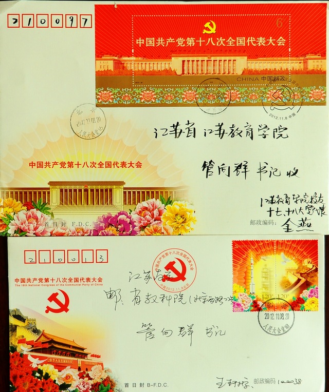 两位校友始终牵挂母校的发展。在十八大召开之际,他们在第一时间寄来了首日封,与母校师生一起分享十八大召开的喜悦,表达了对母校培育的感激之情,并祝愿母校越办越好,桃李满天下。