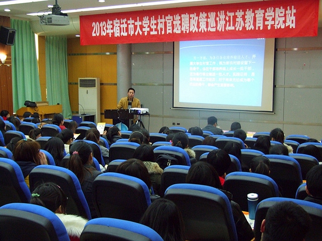 会上,宿迁市大学生村官政策宣讲团简要介绍了宿迁市的基本概况和大学生村官在宿迁的生活和工作现状,向与会学生传达了今年该市选聘高校毕业生到村任职的有关政策,并对报名等相关程序作了详细解读。