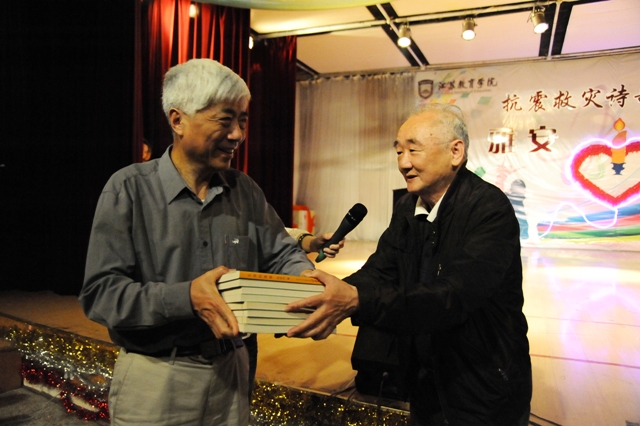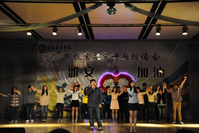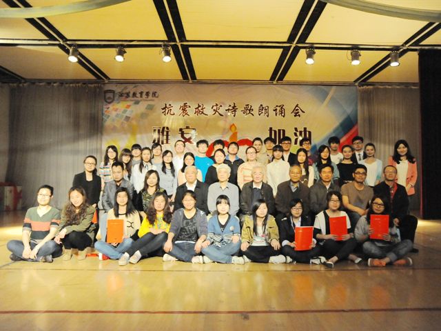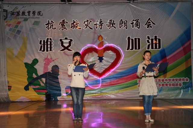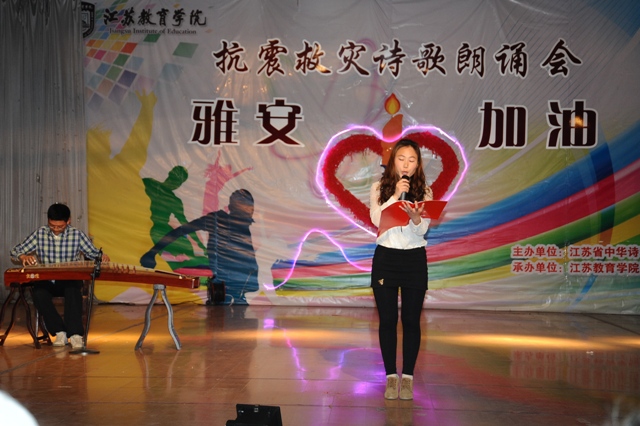 4月27日,时值雅安地震发生的第7天,由江苏中华诗学研究会主办,我院承办的“雅安诗祭”主题诗歌朗诵会在浦口校区礼堂举行,众多师生与著名诗人共聚一堂,以诗歌之名,向在雅安地震中逝去的生命寄托哀思,向奋战在震区一线的救援者们表示敬意!