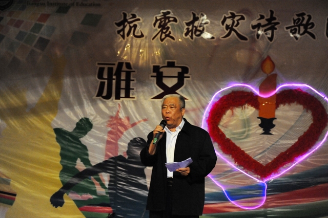 我院中文系教授、江苏省中华诗学研究会会长江锡铨在接受记者采访时称:雅安地震,牵动全国人民的心,今天正好是雅安地震的七日祭,借这个契机表达我们共同的哀思。中华诗学研究会希望能够用诗歌朗诵会的形式唤起身边的人对灾情、灾区的关注,用实际行动表达对灾区民众的关怀。愿逝者安息、生者坚强!相信在全国同胞的共同关注下,雅安人民的明天将会更加美好!