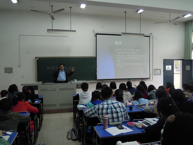 5月8日下午,南京大学丁言仁教授应邀为外语系作了一场精彩的学术讲座:背诵与模仿——演讲比赛优胜选手的学习方式。丁教授首先结合对三位国际演讲比赛中获奖同学的英语学习方法的研究实验,向同学们介绍了几种可行的英语学习方法,随后又向同学们推荐了一些语言学专家提倡的学习英语的方法,最后他重强调了自主学习的重要性。
