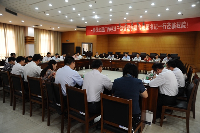 5月24日,广西经济干部管理学院党委书记韦茂繁同志一行来我院考察交流。我院党委副书记、副院长程建军,纪委书记刘青平,副院长刘继红等给予热情接待,双方在草场门校区教科研楼511会议室举行了座谈。