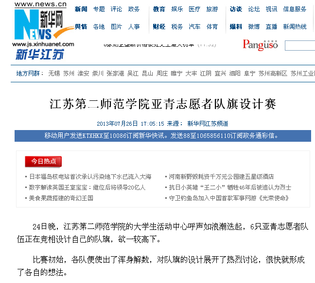 新华网江苏频道报道我院亚青志愿者培训团队文化活动——队旗设计大赛 亚青志愿者培训夏令营自开班以来开展了丰富多彩的文化活动,7月26日,新华网江苏频道转载了题为《江苏第二师范学院亚青志愿者队旗设计赛》的通讯,介绍了我院组织开展该项亚青志愿者文化活动的情况,全文如下: 24日晚,江苏第二师范学院的大学生活动中心呼声如浪潮迭起,6只亚青志愿者队伍正在竞相设计自己的队旗,欲一较高下。 比赛初始,各队便使出了浑身解数,对队旗的设计展开了热烈讨论,很快就形成了各自的想法。 技术队简约新颖,志愿者之家美观大方,综合队丰富多彩,竞赛队设计独特,观服队洋溢着满满的爱心,媒体队才艺皆备啊有木有! 由于各队的设计都是极好的,小 团委 刘琦