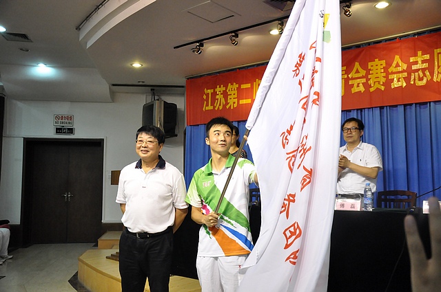 最后,程建军在热烈的掌声中为亚青会志愿服务团队授旗。