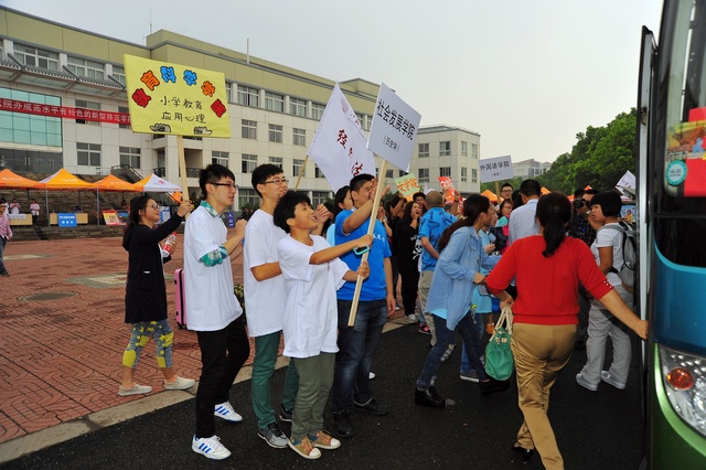 一大早,草场门、浦口、小行三校区的迎新点上就满是一派热闹的景象,校园内彩旗招展、欢迎新生条幅和接待服务标牌格外引人注目。我院各部门、各院(系)各出奇招,为新生提供贴心便捷的服务,专业化的志愿者队伍、便捷的报到流程设计都使新同学充分感受到学校的归属感。社会发展学院播放着学长、学姐欢迎新同学的VCR;城市与资源环境学院绘制了地图,让新生在他的家乡标上姓名,勉励他们在校四年里为家乡争光,为江师院添彩;现代传媒学院在报到入口处,照相机拍下新生与院标的合影,为他们留下刚入学时的珍贵影像;文学院克服了报到新生多、学院人手紧的困难,圆满完成了544名新生的入学工作;学通社、广播台还为新生们准备了印有我院风景照的明信片,让新生写下自己的“中国梦﹒师范梦”,希望新生努力学习,早日圆梦……新生报到已不仅仅是形式上的入学流程,更已经发展成为了新生融入我院大家庭的一次欢乐盛会。