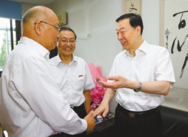 图为在江苏第二师范学院,省委书记罗志军与王铁军教授亲切交谈,代表省委、省政府向全省教师和教育工作者致以节日的问候和崇高的敬意。