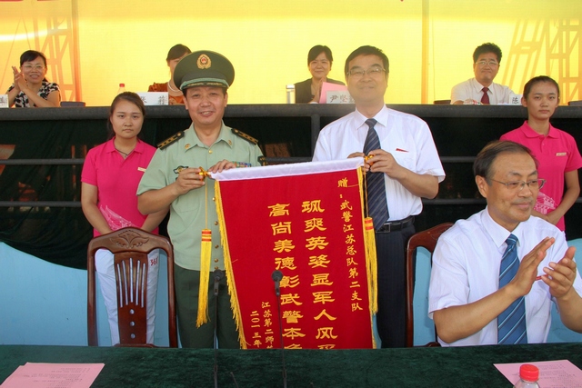 郭阳宣读了军训表彰决定。院领导为先进集体、内务标兵寝室、先进个人和优秀带队教师颁发了奖状。丁晓昌代表我院向承担施训任务的武警江苏总队第二支队赠送了锦旗。