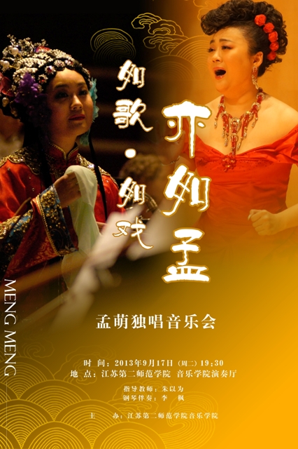 9月17日,音乐学院特邀青年女高音歌唱家孟萌来我院举办“如歌•如戏——亦如孟”个人独唱音乐会。副院长王仁雷、张勤,教务处处长蔡飞、副处长薛瑞东以及院教学督导熊宁教授亲临现场观摩,音乐学院全体教师和2013级新生参加。