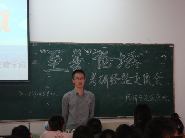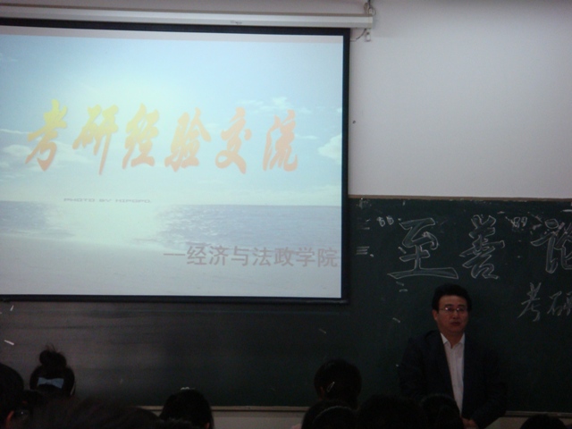 09届思政专业的郝凤,09届工商管理的谢天添、李长春、仇鑫等四位同学分别上台,介绍了考研的基本事项以及各自的考研心得。