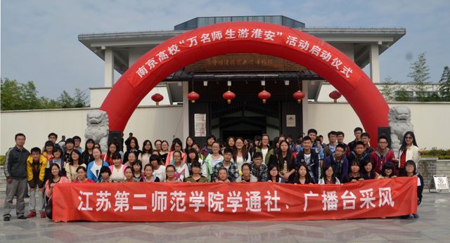 10月19日,应淮安市政府、旅游局的邀请,在宣传部陶赋雯、单哲远两位老师的带领下,学通社和广播台的同学们赴淮安参加了“南京高校万名师生游淮安”活动启动仪式,并游览了淮安的风景名胜。