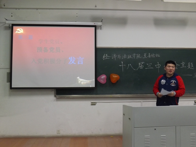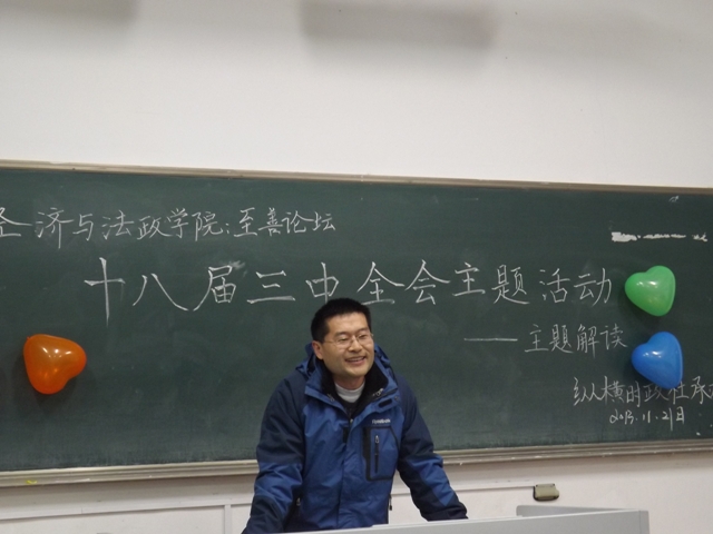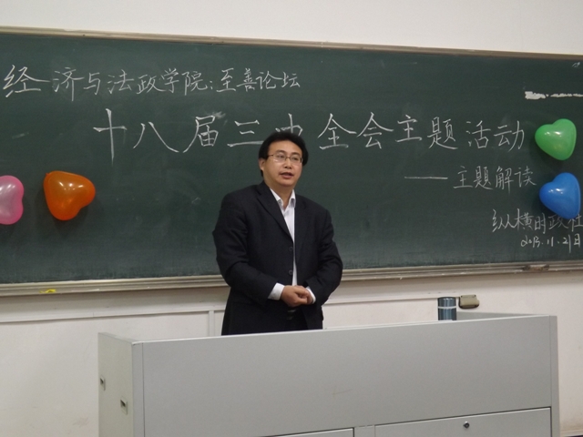 11月21日晚,经济与法政学院“至善论坛”之十八届三中全会主题解读会在浦口校区教学楼118教室举办,纵横时政社承办本次活动。党总支书记李安林出席并讲话。