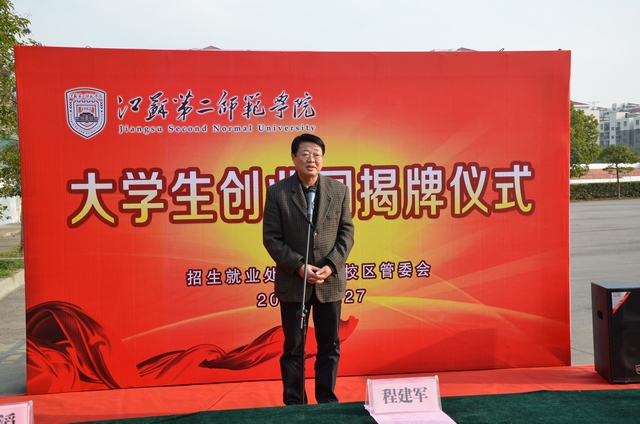 程建军发表讲话。他首先对高新区软件园、沿江街道给予我院大学生创业工作的大力支持和帮助表示衷心的感谢,并对首批入驻大学生创业园的创业团队表示热烈的祝贺。他针对大学生创业园的工作提了三点希望和要求。一是大学生创业园的成立,为我院广大在校生点亮创业之路、实现青春梦想提供了一个很好的发展平台和机遇,希望我院大学生创业团队要抓住机遇、不言放弃、努力尝试、走向成功。二是希望相关职能部门和二级学院为他们提供最好的创业环境和创业氛围,优质的服务体系和服务水平,使他们更好地发挥自己的聪明才智,在创业创新的道路上,取得辉煌的成绩。三是希望同学们除了在校内创业还要积极走出去,与社会接轨。最后程书记表示希望借助我院大学生创业园的启动,进一步深化与南京市高新区软件园、沿江街道的校地合作。