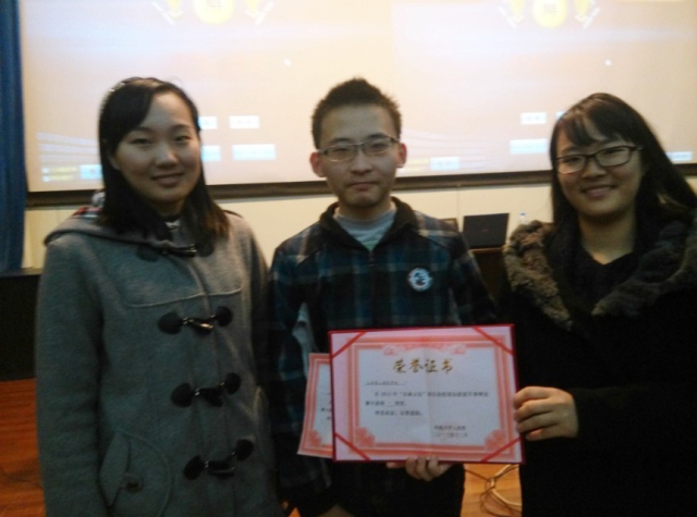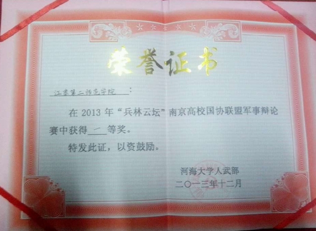 12月8日下午,我院国防协会代表队参加了由河海大学主办的“兵林云坛”南京高校国防知识辩论赛,此次活动在江宁会议中心举行,旨在促进南京高校间国防知识交流,南京航空航天大学、南京工业大学、河海大学、东南大学、南京邮电大学等12所高校参赛。在此次辩论赛中,我方辩手以扎实的国防知识功底、犀利的言辞、良好的辩风受到评委的一致好评,获得团体一等奖的好成绩,2012级教育技术专业的何贵鹏同学获得“最佳风度辩手”称号。