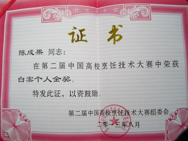 在今年七月底举行的第二届全国高校烹饪技术大赛决赛中,代表江苏地区高校参赛的我院后勤服务总公司饮食中心员工陈成果,精心准备,沉着应战,一举获得了白案个人金奖(一等奖)的好成绩。