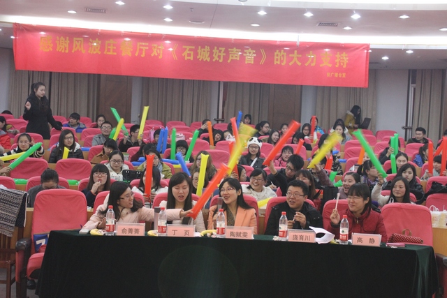 12月12日,由院广播台主办的“石城好声音”总决赛在现代教育技术楼二楼报告厅举行。院办文秘科科长庞育川、宣传部宣教科科长陶赋雯、生化学院办公室丁页、教务处高静、宣传部俞菁菁五位老师担任评审老师。比赛现场气氛热烈,精彩纷呈。